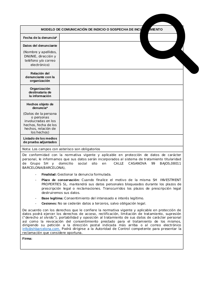 - Retention period: Once the reason for the complaint is concluded, Grupo Sh will keep your personal data blocked for the periods of legal prescription or claims. Once the periods of legal prescription have expired, we will destroy your data.